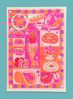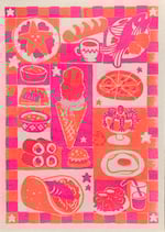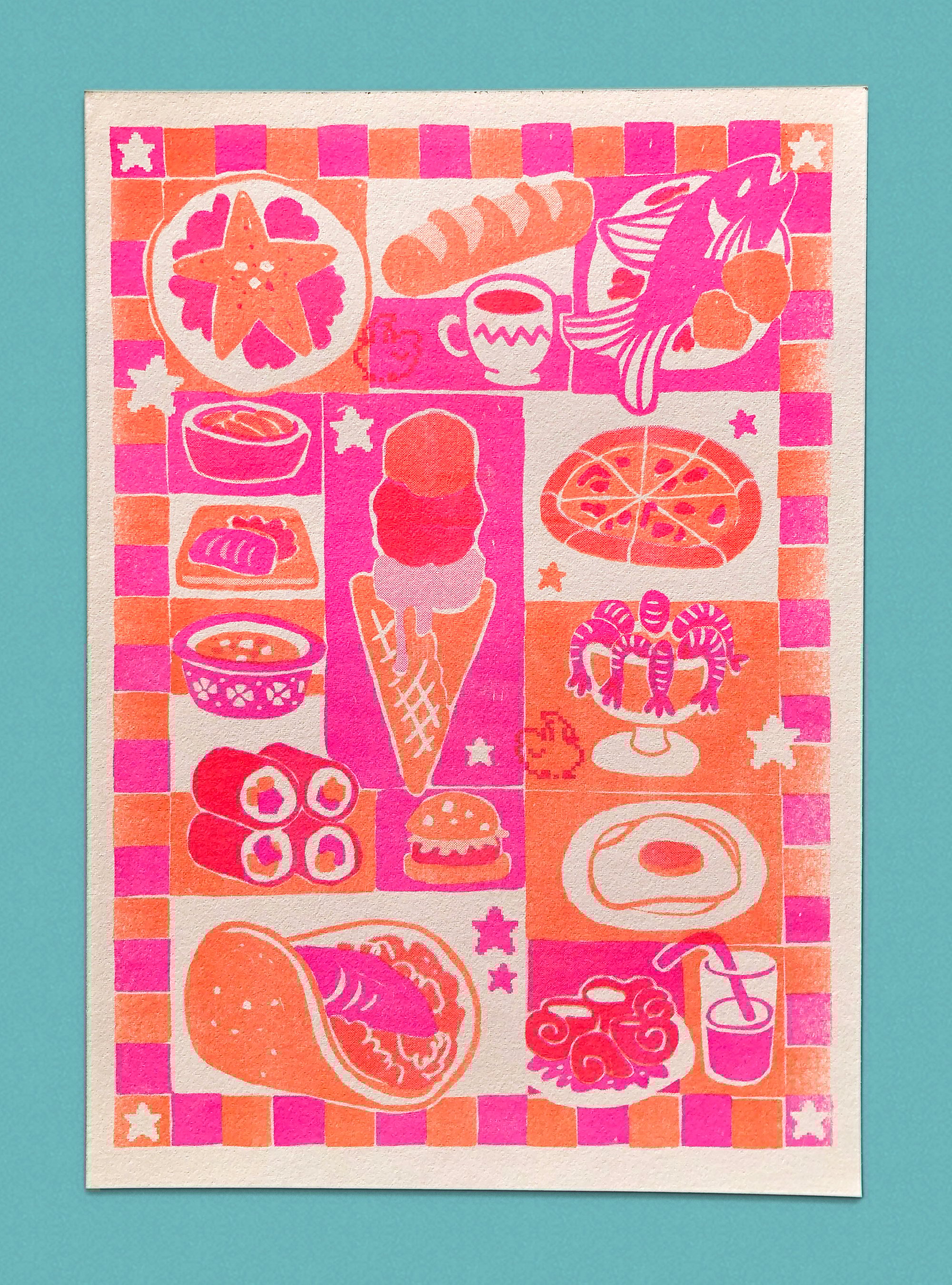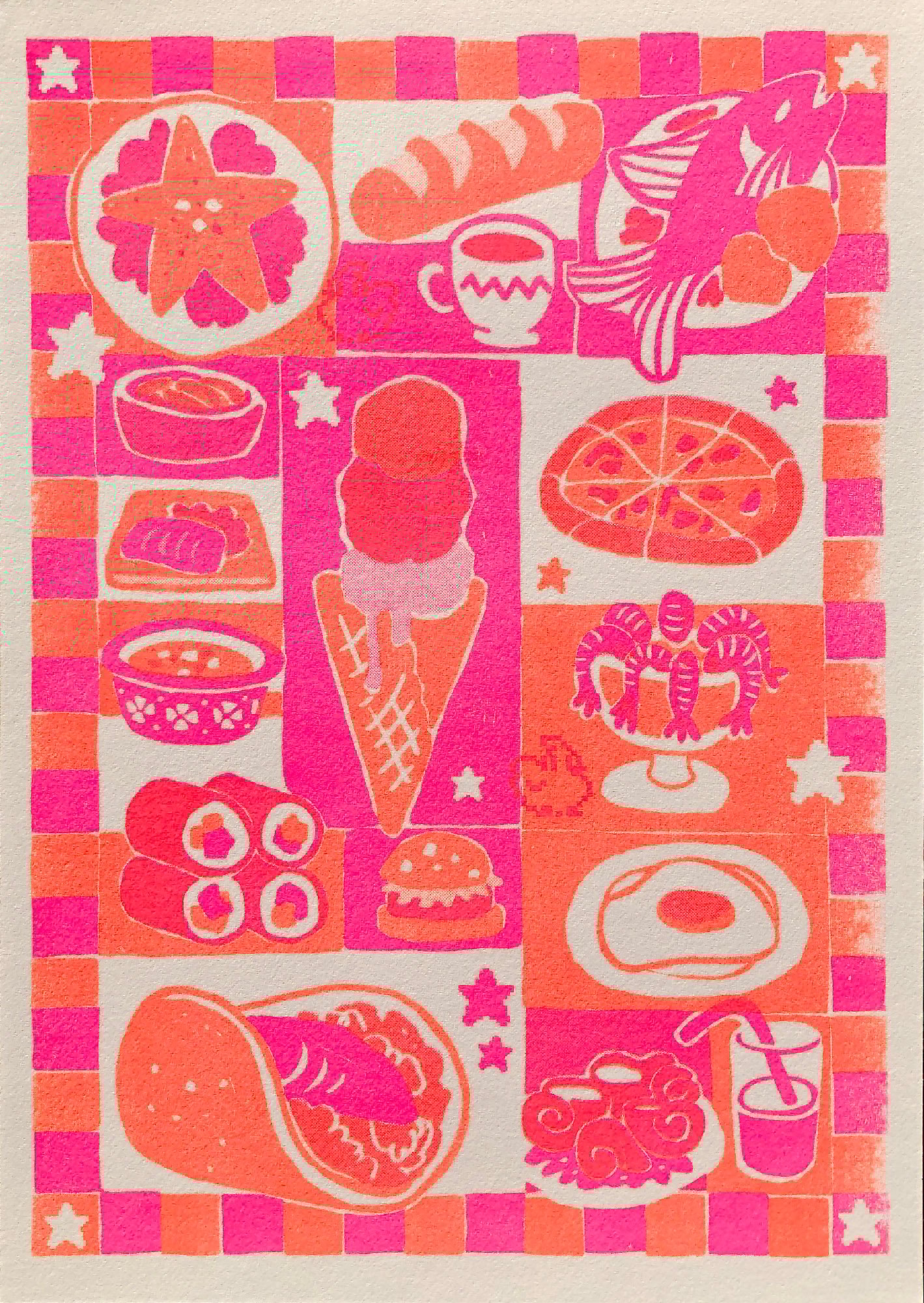 A3 size risoprint of some of the cooking recipes from Stardew Valley! This print is one of a kind, is made to order, and signed on the back. Perfect for any cozy game lover. Printed in fluorescent pink and orange.